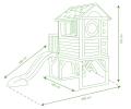Dodatkowo domek wyposażony jest w zjeżdżalnie o długości 150 cm, do której można podłączyć wąż ogrodowy i zamienić ją w zjeżdżalnie wodną, dwa okna z przesuwanymi okiennicami, połówkowe drzwi oraz stabilną drabinkę do wchodzenia do domku.