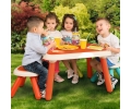 Czerwony stolik z czterema nogami. Wygodna i stabilna konstrukcja, dzięki nogom wykonanym w technologii blowmoulded. Duża przestrzeń stolika, aż 76 cm pozwala nawet 4 dzieci wspólnie się bawić na przykład rysując lub jeść przekąski.